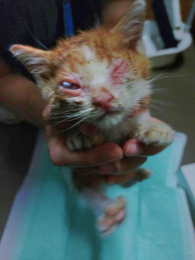 重度の眼脂で目を開けることができず、鼻も鼻汁によってふさがれており