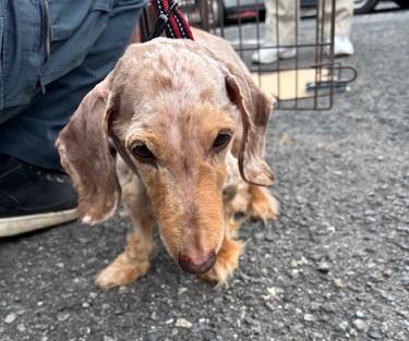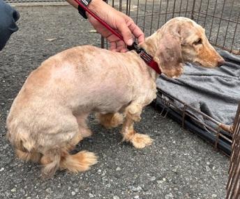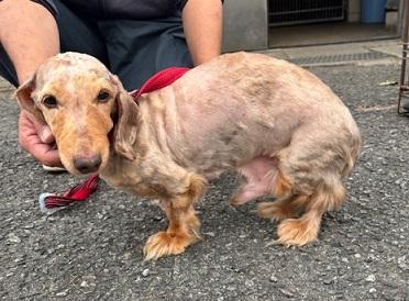 首輪はしておらず、四肢及び尾以外の毛がカットされています。大人しく、あまり若くはないと思います。
