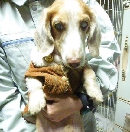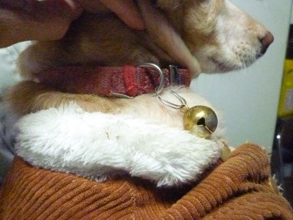 すず付きの赤い首輪と茶色のウェアを着けています。