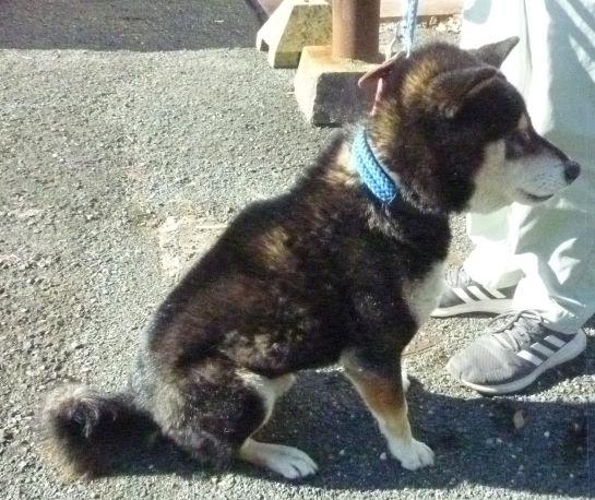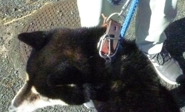 赤色の首輪に、青いリードがついていました。