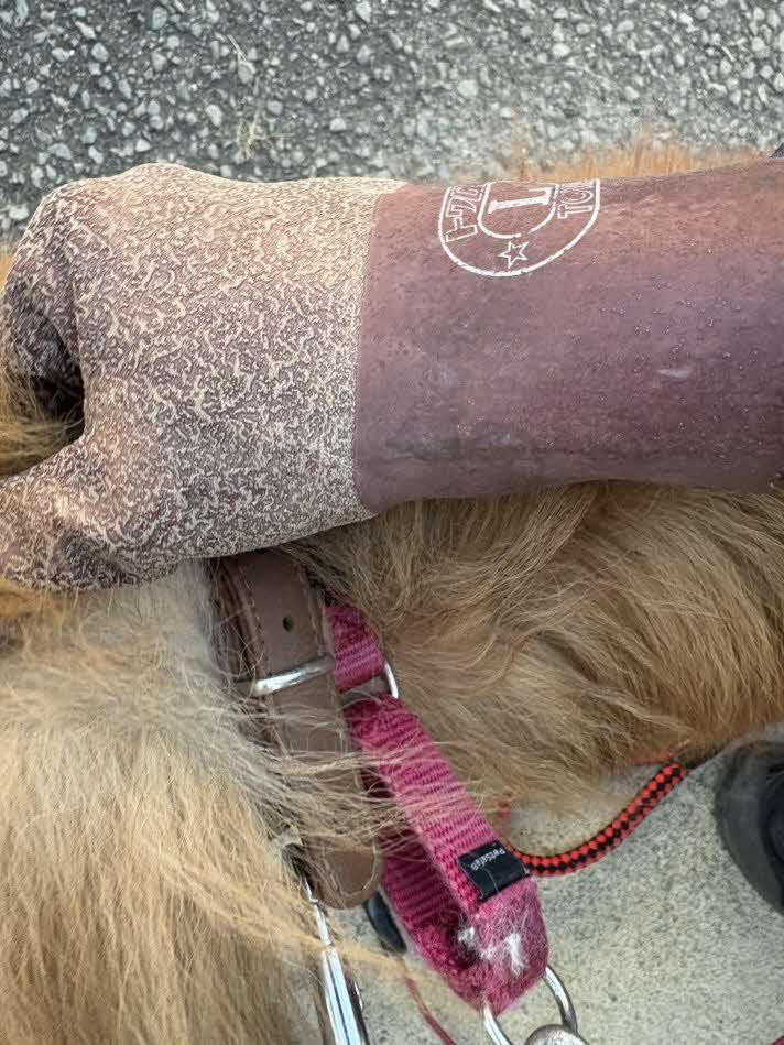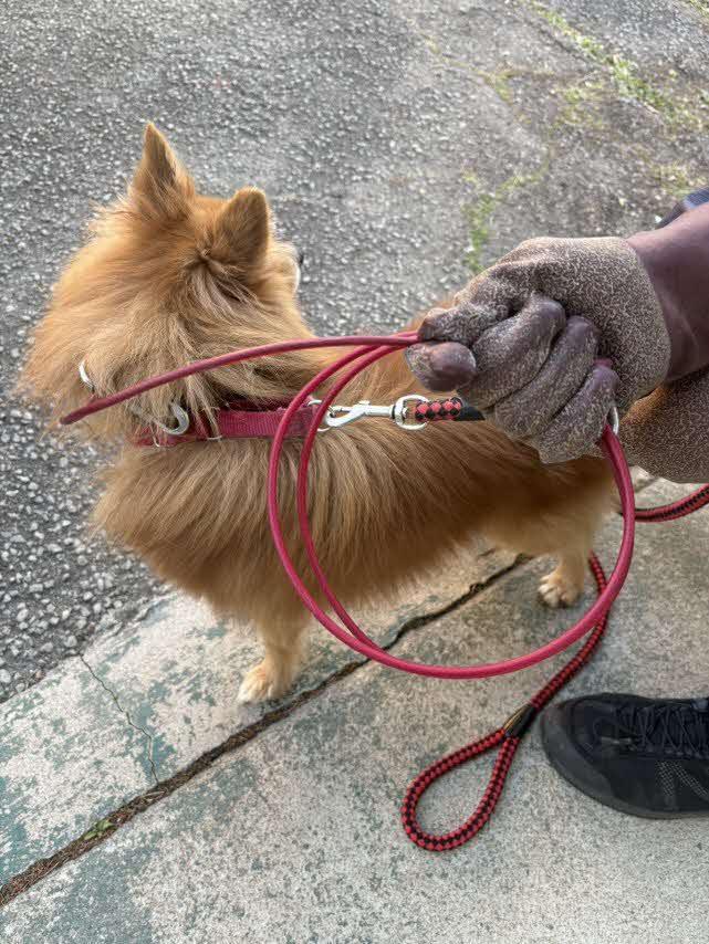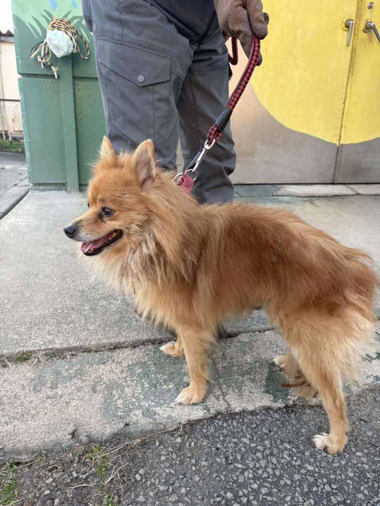 - 革製茶色首輪(赤色ハート柄切抜きあり)及び赤色ワイヤーリードを装着していました。