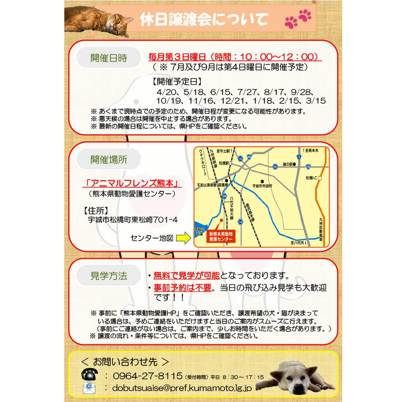 保護犬と保護猫の譲渡を進めるため、「アニマルフレンズ熊本(熊本県動物愛護センター)」において、下記のとおり休日譲渡会を開催します。見学は無料となっておりますので、皆様のご来所を心よりお待ちしております。