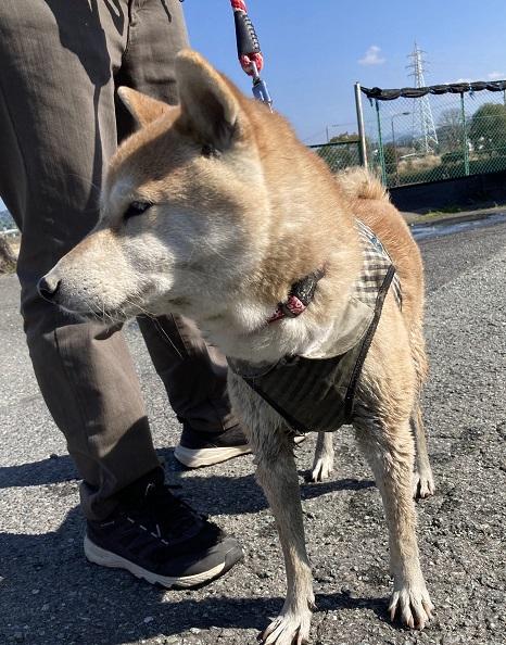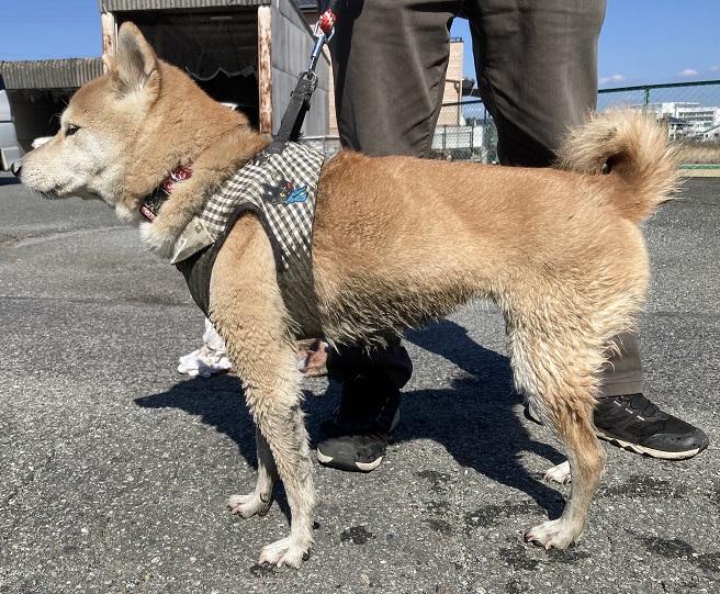 唐草模様の入った赤い首輪をしており、黒いギンガムチェック布製ハーネス