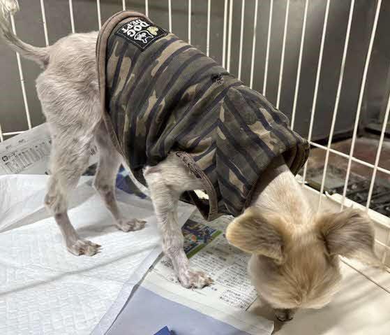 首輪はありませんが、迷彩柄のフード付き洋服を着けています。
