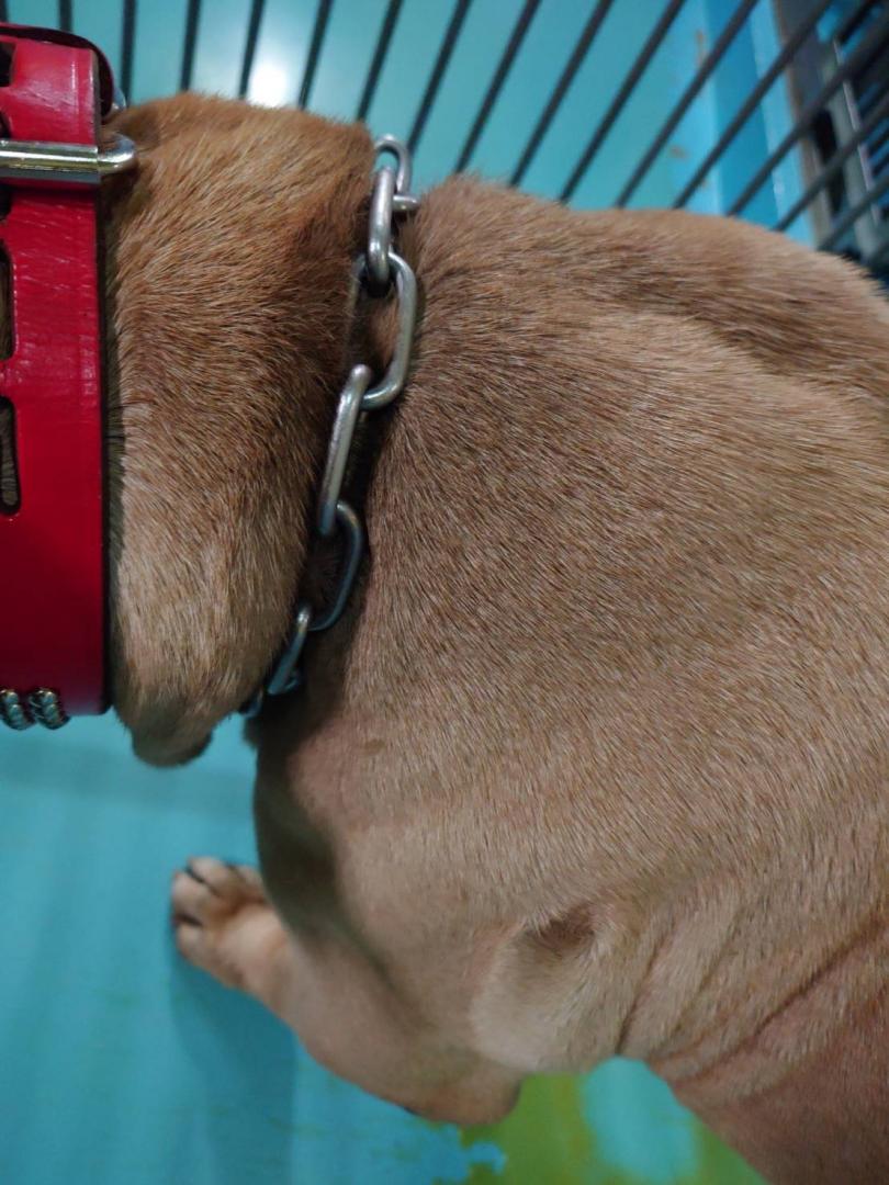 チェーン首輪と赤黄黒の布製首輪を装着していました。