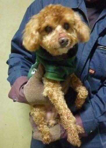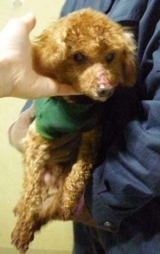 トイプードルの雄で、白内障があり、歯がぬけて舌が出ています。