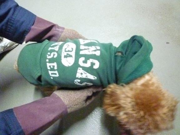 首輪・マイクロチップの装着はないですが、緑色のパーカーを着用しています。