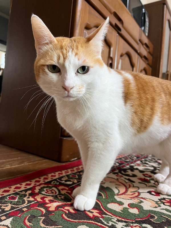 - 白茶トラのメス。約10歳。首から背中にかけて丸い(アーモンド型)模様が4つある。顔はシュッとしており、可愛いより美人。目の色は黄色〜黄緑色で鼻と肉球の色はピンク。臆病な性格。室内外のためパニックを起こしている可能性あり。
